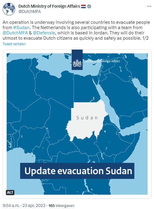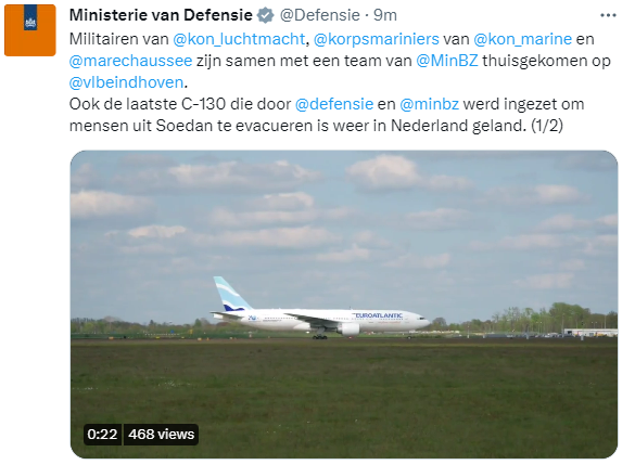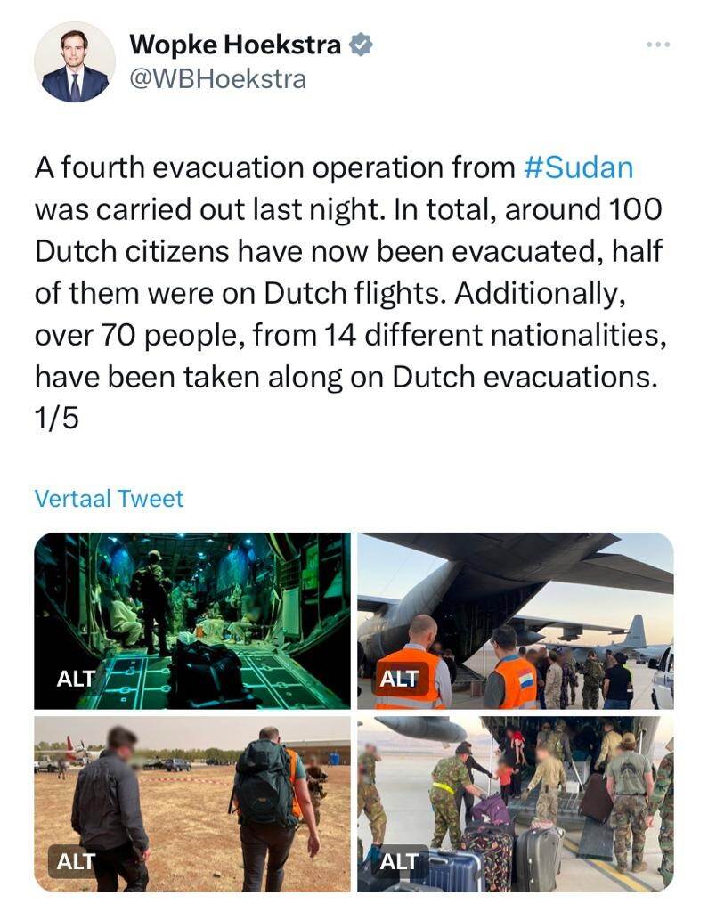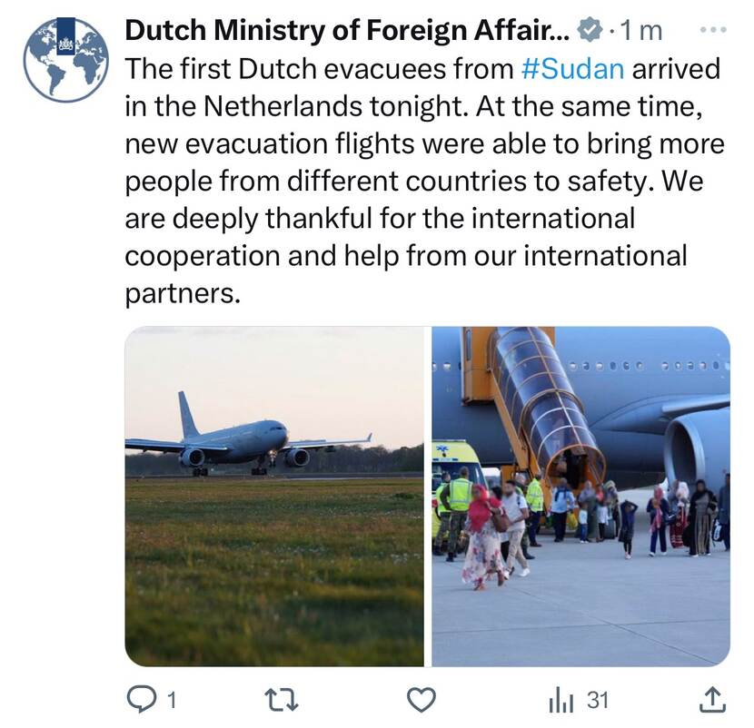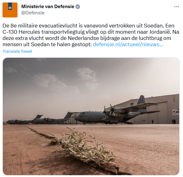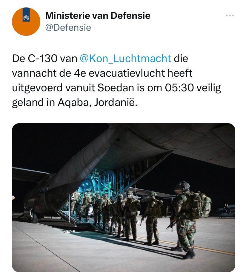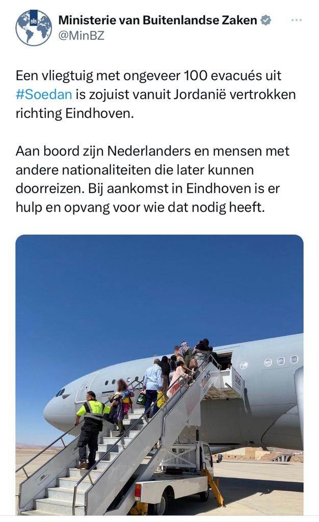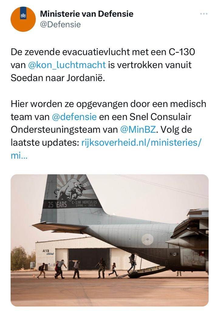 The Netherlands has completed seven evacuation flights from Sudan. At least 160 Dutch citizens have now safely been evacuated, over 85 by the Royal Netherlands Air Force. Around 130 people from 18 other nationalities were also evacuated on Dutch flights. Various international partners are still carrying out evacuation flights. We greatly sympathize with anyone currently in Sudan. Read the update by the Ministry of Foreign Affairs on Twitter.