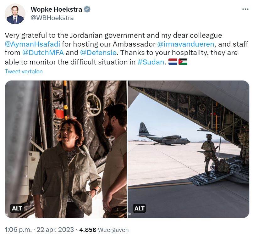 Dutch Minister of Defense Kajsa Ollongren is very happy with the good collaboration with other countries during the evacuations from Sudan. 'Much appreciation for the efforts of all our soldiers and the team of @MinBZ. Due to the airlift with Germany and France, among others, many people from Sudan have been brought to safety. Special thanks also to host country Jordan for making these complicated operations possible.'