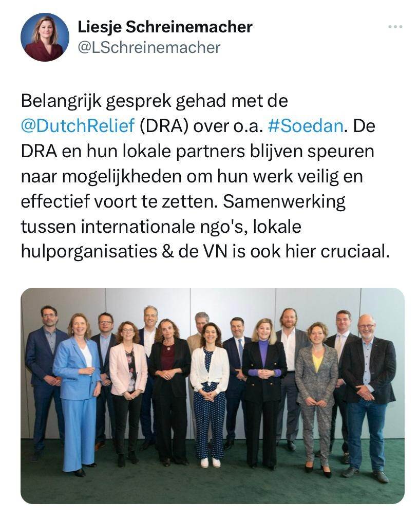 Minister Schreinemacher of Foreign Trade and Development Cooperation spoke with Dutch Relief (DRA) today about the situation in Sudan. 'The DRA and their local partners continue to look for ways to continue their work safely and effectively.'