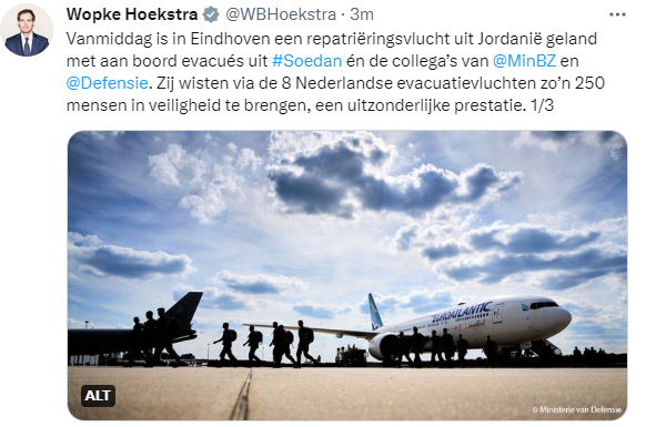 Minister Hoekstra on Twitter: 'Over the last three days, the Netherlands has completed six evacuation flights from Sudan. At least 150 Dutch citizens have left the country safely, over 70 on Dutch flights. These flights also carried around 100 people from 18 different nationalities. Yesterday we welcomed the first 104 evacuees in Eindhoven, an emotional moment. Later that evening, 43 Dutch people arrived by bus from Germany. None of this would have been possible without the help of our international partners. I have great admiration for Foreign Affairs and Defence colleagues, who continue to work day and night supporting evacuees and bringing them to safety.'